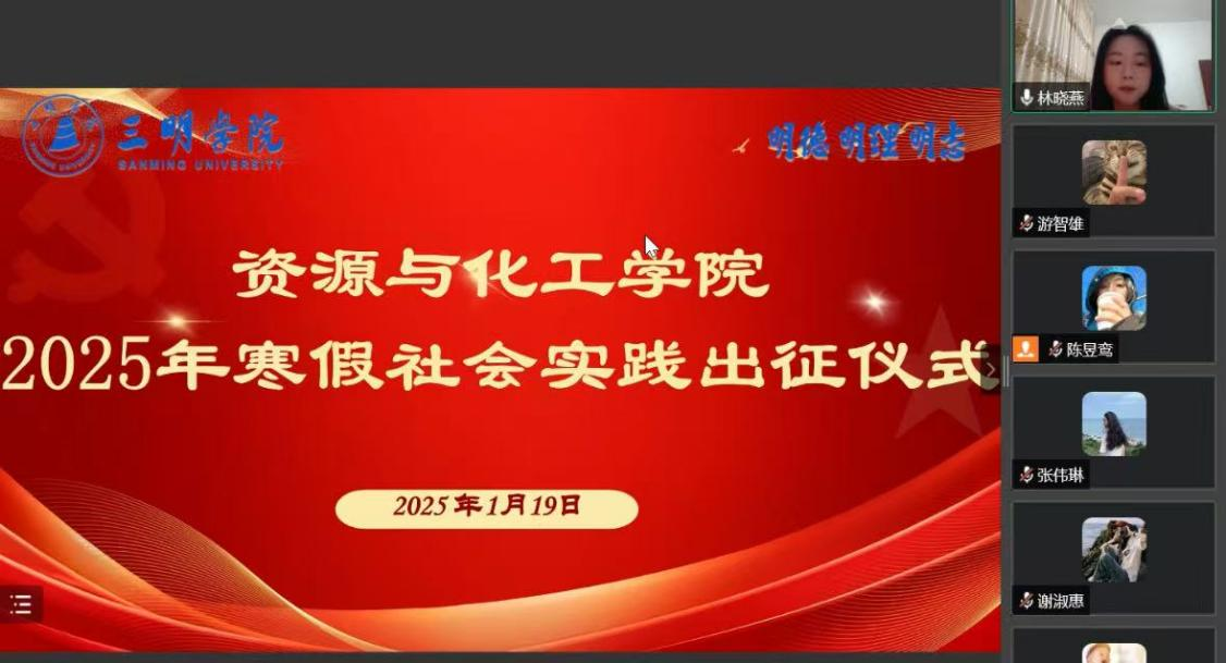 为进一步坚定强国兴国理想信念、锤炼爱党爱国本领能力,奋力书写为中国式现代化挺膺担当的青春篇章,资源与化工学院于1月19日在线上举行2025年寒假社会实践出征仪式,资源与化工学院团委副书记、各班团支部委员、各实践团队成员及学生会骨干代表共100余人参与此次仪式。