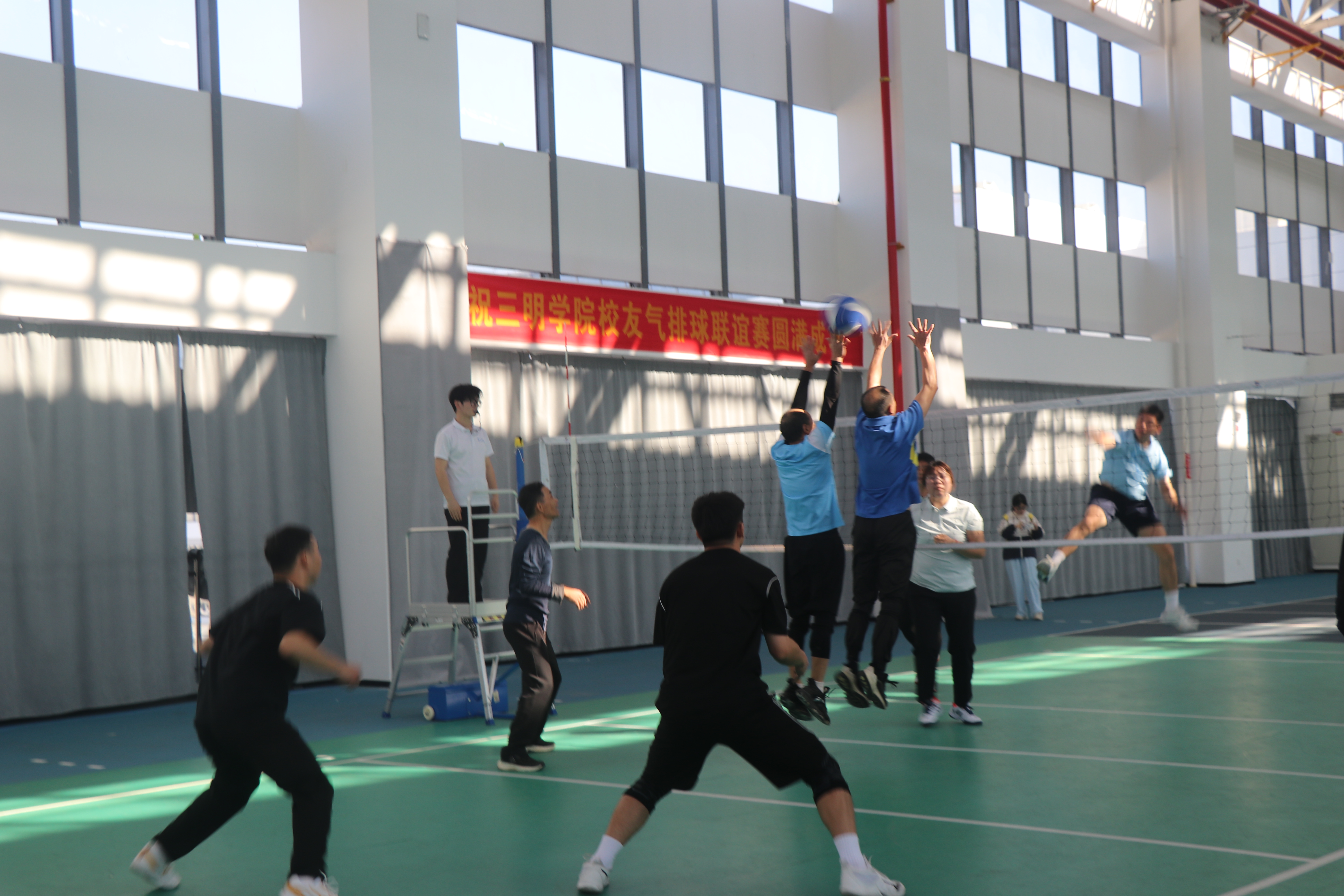 校领导张君诚、吴龙等为获奖队伍颁发奖杯,并与校友合影留念。运动场上的扣杀声和欢呼声交织在一起,仿佛让校友们重回年少时光。这场专属于校友的切磋,无关胜负,只为重温那段热血沸腾的青春岁月。