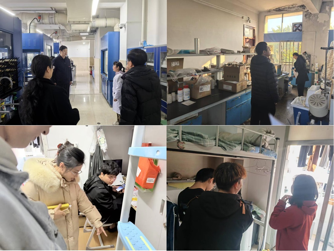 检查组走访学生宿舍,排查冬季用电、消防等方面的安全隐患,了解学生假期离校安排,提醒同学们注意出行安全,务必做到人离电断,确保宿舍安全。在学院办公区域,对电线电路、门窗锁闭以及消防器材等进行了全面检查,要求各科室在假期前严格落实安全责任制,做好防火防盗等各项措施。
