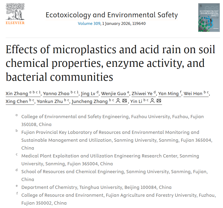 近日,资源与化工学院生态环境修复团队以Effects of microplastics and acid rain on soil chemical properties, enzyme activity, and bacterial communities”为题,在国际知名期刊《Ecotoxicology and Environmental Safety》上发表了微塑料与酸雨对土壤生态系统功能影响的研究成果。张欣(我校与福州大学联培研究生)、赵燕娜(资源与化工学院教师)为论文共同第一作者,李银教授和张君诚教授为论文共同通讯作者,三明学院为通讯单位。