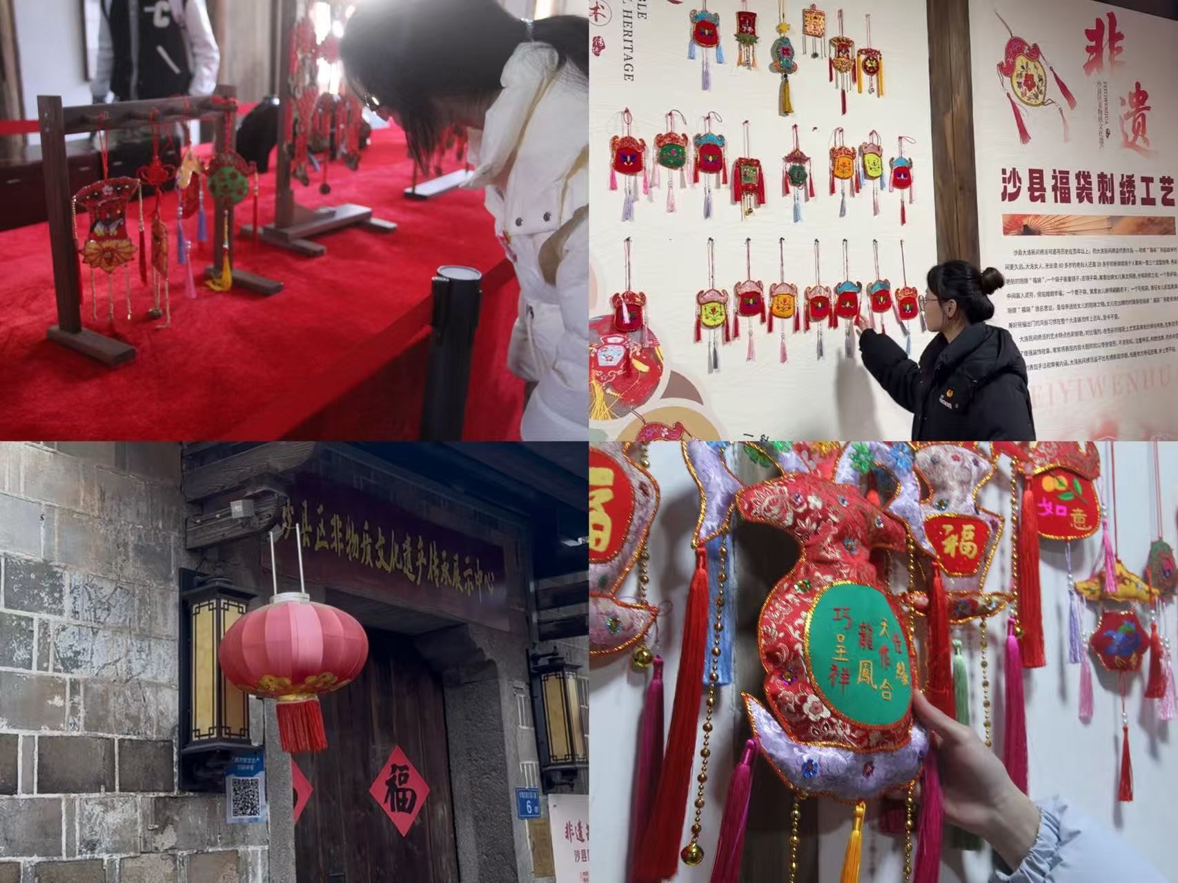 在展示中心,实践队系统考察了漆器、高砂陶瓷、龙舟、扎染等本土非遗项目,并重点聚焦于福袋刺绣展区。队员们从“官帽形”“平安形”等传统形制中体会匠心独运,从“步步高升”“甜甜蜜蜜”等纹样寓意中解读民俗智慧。通过近距离观摩与讲解学习,同学们深刻感受到非遗背后深厚的“闽人智慧”与生活哲学,为传承三明地区优秀传统文化积累了鲜活素材。