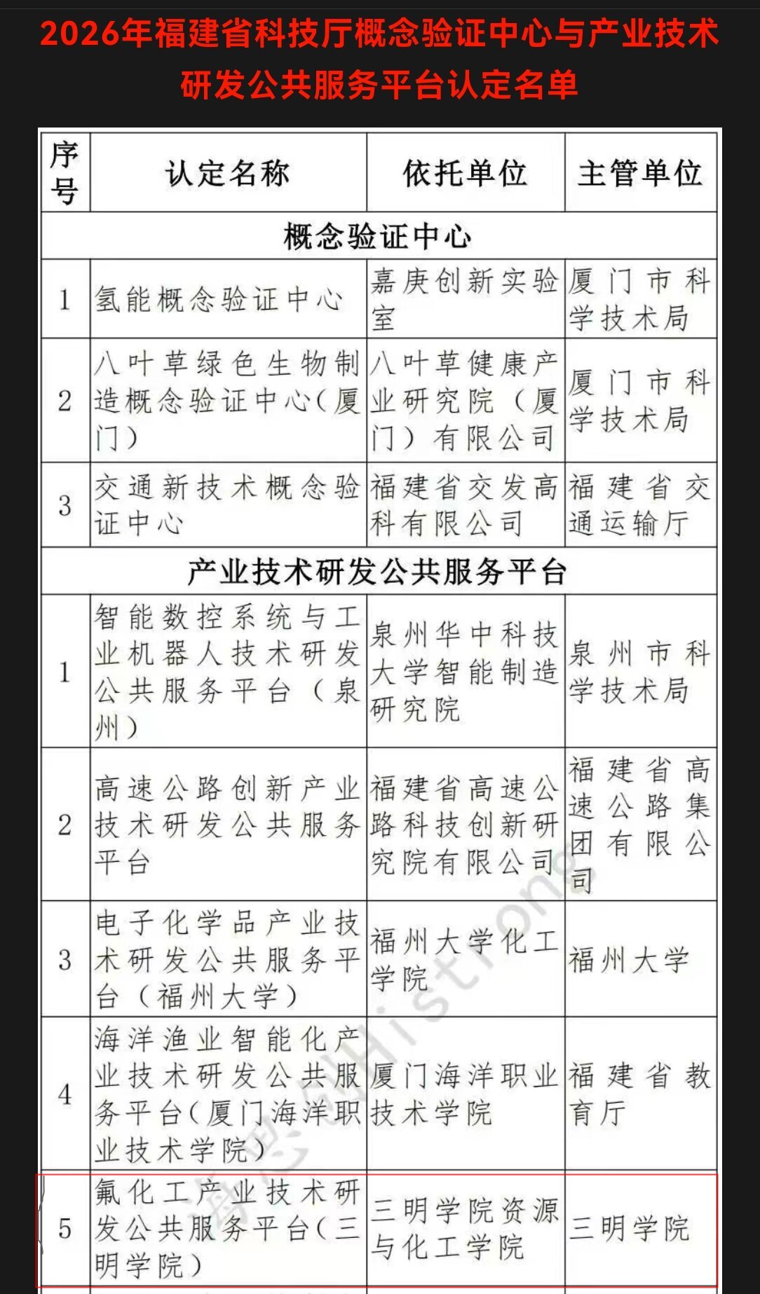 4月24日,福建省科学技术厅发布《关于公布2026年概念验证中心与产业技术研发公共服务平台认定名单的通知》(闽科服〔2026〕4号),“氟化工产业技术研发公共服务平台(三明学院)”成功入选2026年省科技厅产业技术研发公共服务平台名单。该平台依托三明学院资源与化工学院建设,主管单位为三明学院。此次认定标志着三明学院在氟化工领域的技术创新与公共服务能力获得省级认可,将为区域氟化工产业提供关键技术研发支撑和成果转化服务,助力福建省氟化工产业高质量发展。