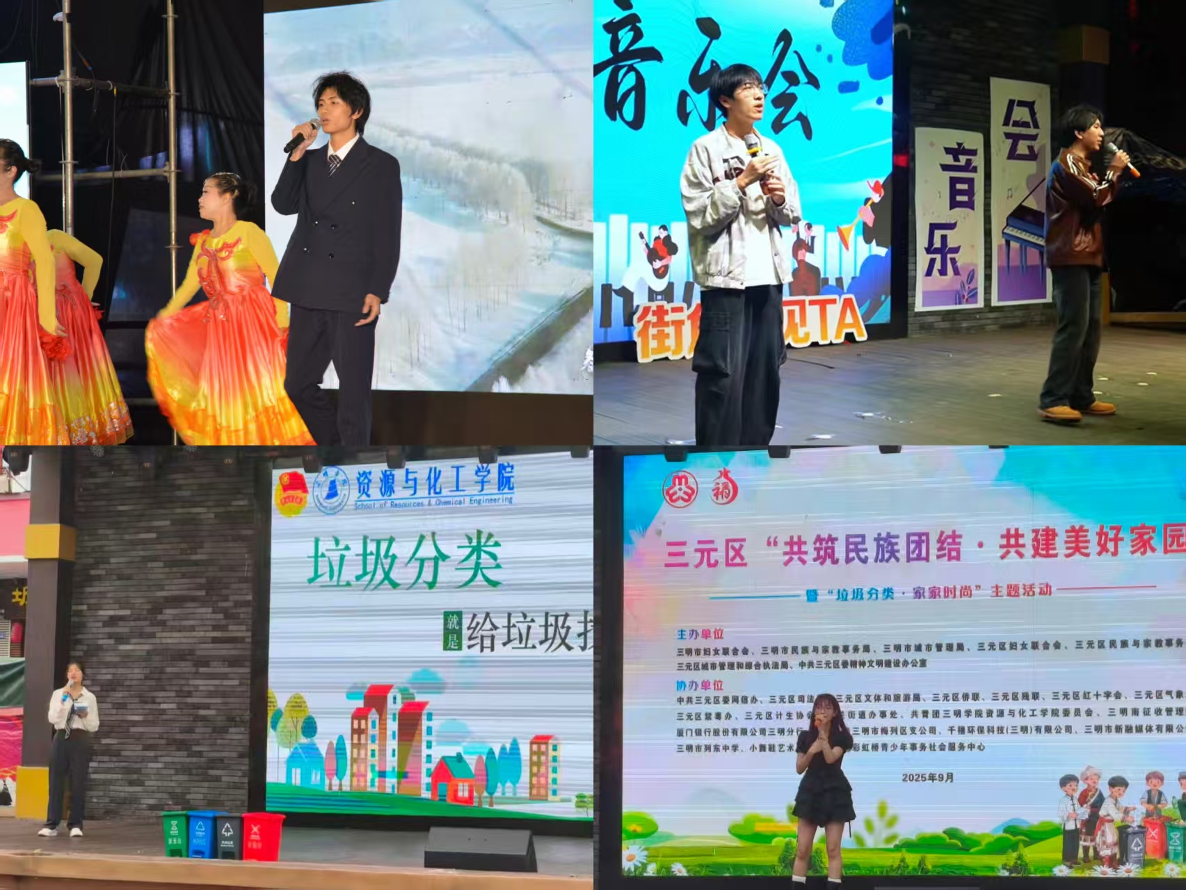 学院团委以校地共建为抓手,推动 “资小艺” 艺术团深度融入地方文化建设与公益宣传实践。艺术团立足文艺初心,先后携手三明市生态环境局亮相万达广场春日生态集市,走进腾飞广场开展环保志愿服务与民族团结宣传活动,积极参与三元区晚风音乐会、“美丽中国我先行” 六五环境日三明主场活动、市妇联公益集市等多项校地联动实践,以艺术之声传播绿色低碳理念,以青春之行传递美育正能量、彰显青年担当。