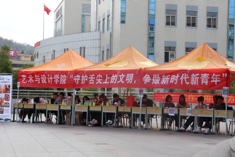 为迎接改革开放精神走进校园,展现当代大学生健康、积极向上、充满自信和青春活力的精神风貌,促进学生德智体美全面发展,推进和提高大学生的综合素质,同时为同学们提供一个健康饮食的环境,2019年11月22日,艺术与设计学院在博学楼门口成功举办守护舌尖上的文明,争做新时代新青年主题活动。