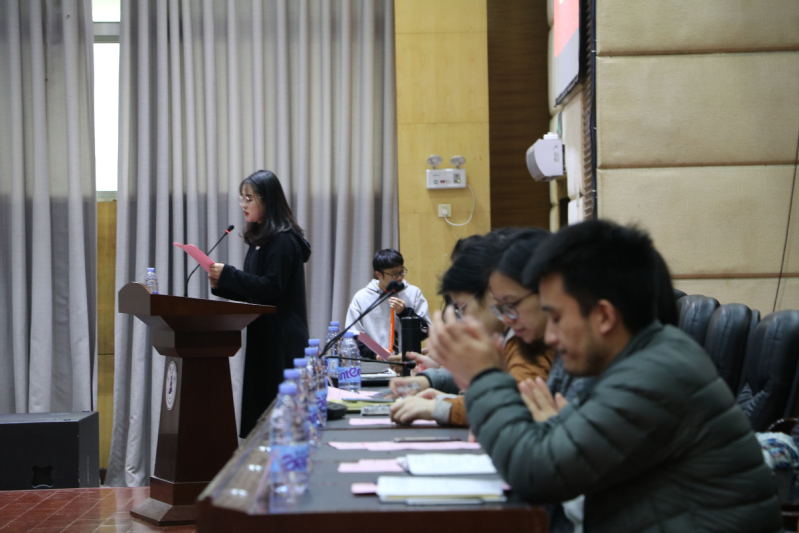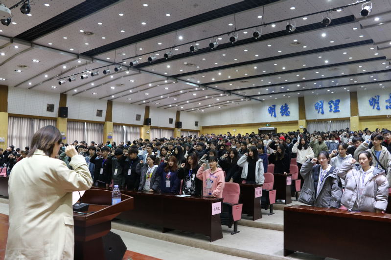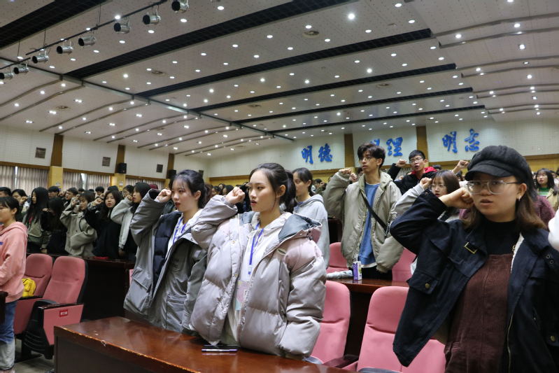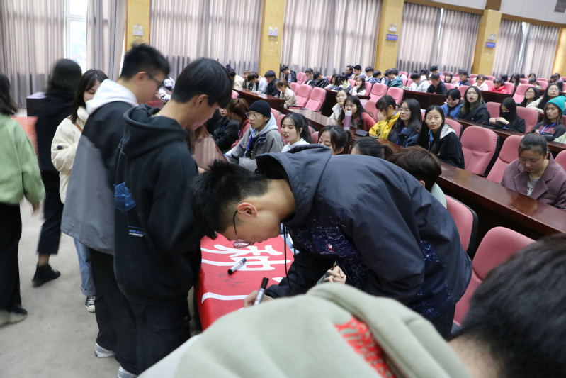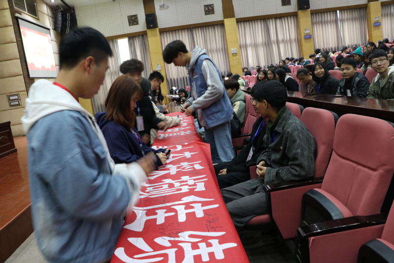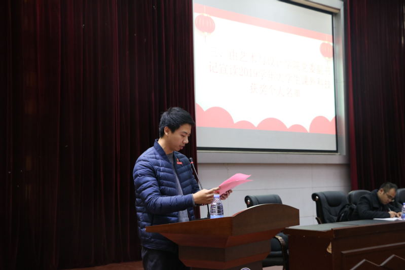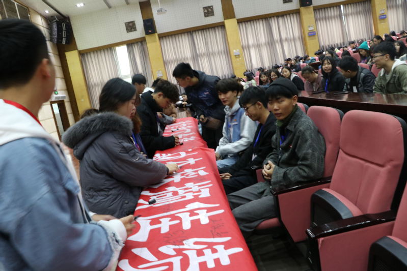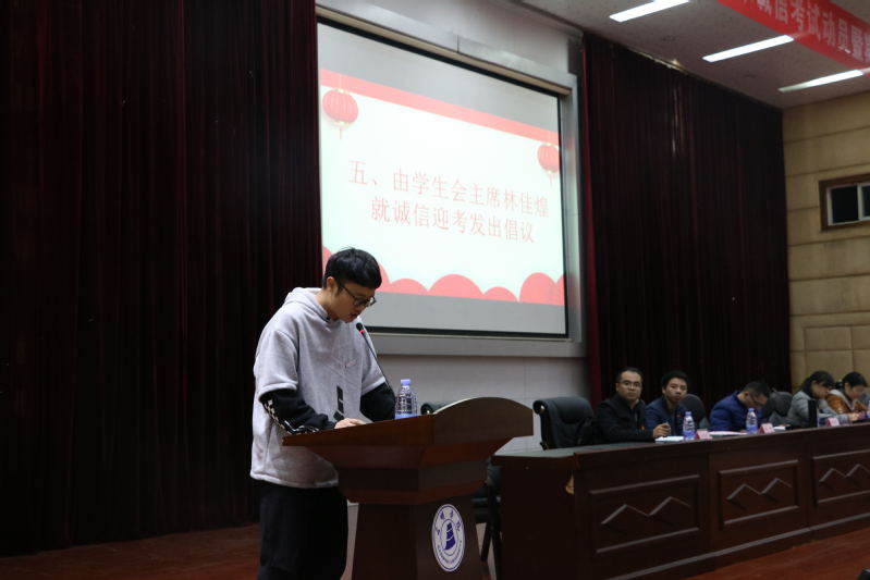 会议上主持人鞠雅楠首先对此会议进行说明并介绍流程后由全体起立奏唱国歌开启了此会议,接下来就是林枭老师宣读2019年大学生课外科技获奖个人名单,希望我们都能像这些优秀同学学习!以之为目标而学习!紧接着,教务科戴红宇老师向大家讲述了学院的期末考试工作安排,望同学们有时间观念,抓紧时间复习。而考试中最重要的就是要诚信,学生会主席林佳煌就诚信迎考发出倡议,学习部部长林雨欣致宣誓词。望同学们能自我约束,端正考试态度。宣誓完毕后,各班级代表上台进行条幅签字仪式。临近放假,张静老师也做了2019年寒假社会实践动员,向同学们交代了寒假社会实践的内容。流程结束,我院党委副书记官丽雅老师对本次大会进行总结讲话。特别告诫了诚信考试的重要性以及考试作弊的处分所带来的严重后果。会议由全体起立奏唱校歌完美落幕。
