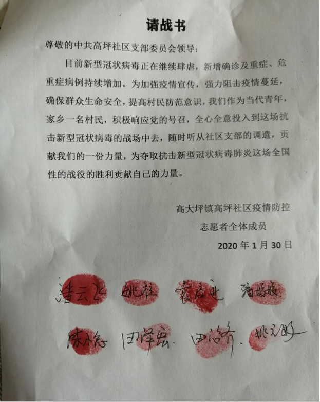 “作为当代青年,积极响应党的号召,全心全意投入到这场抗击新型冠状病毒的战场中去!”在写给贵州省仁怀市高坪社区支部委员会的请战书上,艺术与设计学院2017服装与服饰设计(高职)班潘云飞毅然决然的按下了鲜红的手印。