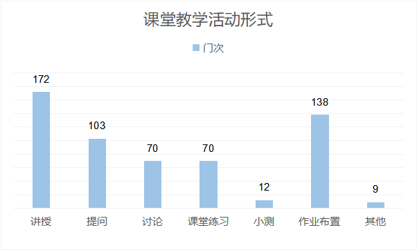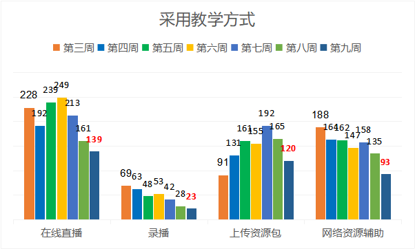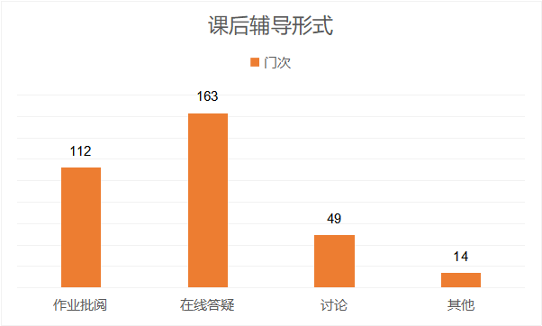 2. 从收集的《网络在线教学运行情况教师反馈表》情况来看,我院在线教学的活动形式比较丰富多样,主要采取的课堂教学活动形式包括:讲授(172门次)、提问(103门次)、讨论(70门次)和课堂练习(70门次)、作业布置(138门次)。从采用的教学方式来看,本周采用在线直播的为139门次,录播23门次,上传资源包120门次,网络资源辅助93门次。从课后辅导形式的反馈情况来看,作业批阅112门次、在线答疑163门次、讨论49门次。