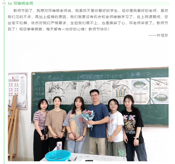 为进一步发扬尊师重教的中华传统美德,丰富大学生在防疫期间文化活动,宣扬勤俭朴素的生活作风,9月16日,艺术与设计学院组织开展“尊师爱生,共话情长”新媒体活动 ,以合影形式表达出对教师的感恩之情,把师生的那一份感恩定格在美丽的校园里。在此,我院为进一步深化“三 明三康”自主学习活动,开展多元化的校园文化活动,展现青春风采,弘扬爱国之志,唱响时代主旋律。