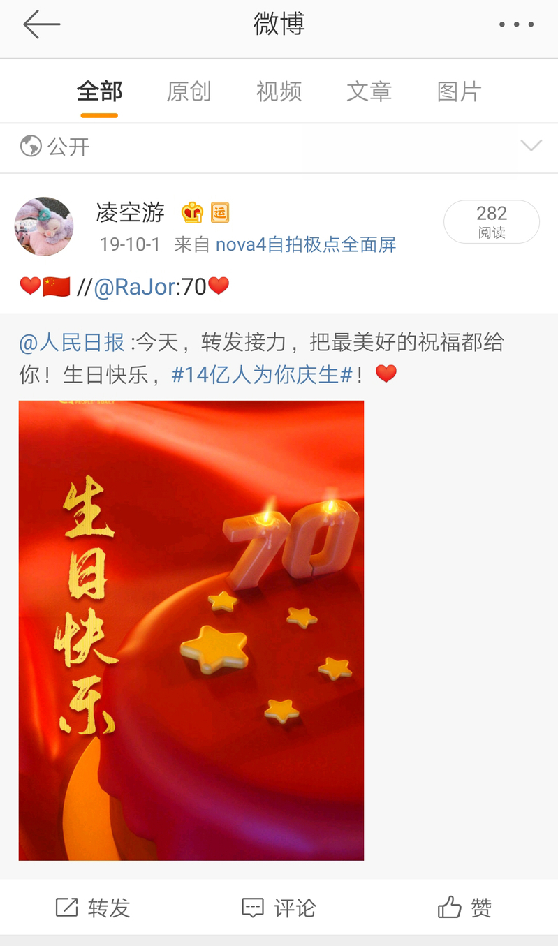 在国庆许多的网民如我通过微博央视直播,看到国庆70周年大阅兵气势如虹,非常震撼人心。在这70年里,祖国经历的风风雨雨,最终日益强大,阅兵仪式让我们全民族人民充满自信,这是70周年的阅兵仪式给我们大家展示了中国的强大,努力实现国家富强人民富裕。阅兵仪式里的战士,他们的使命担当是保家卫国,微博评论里大家都至今这些最伟大最勇敢又最可爱的人,谢谢你们。国庆70周年大阅兵,它是一场很伟大的爱国教育活动。传递中国红色正能量,它唤起中国人民的爱国心。
