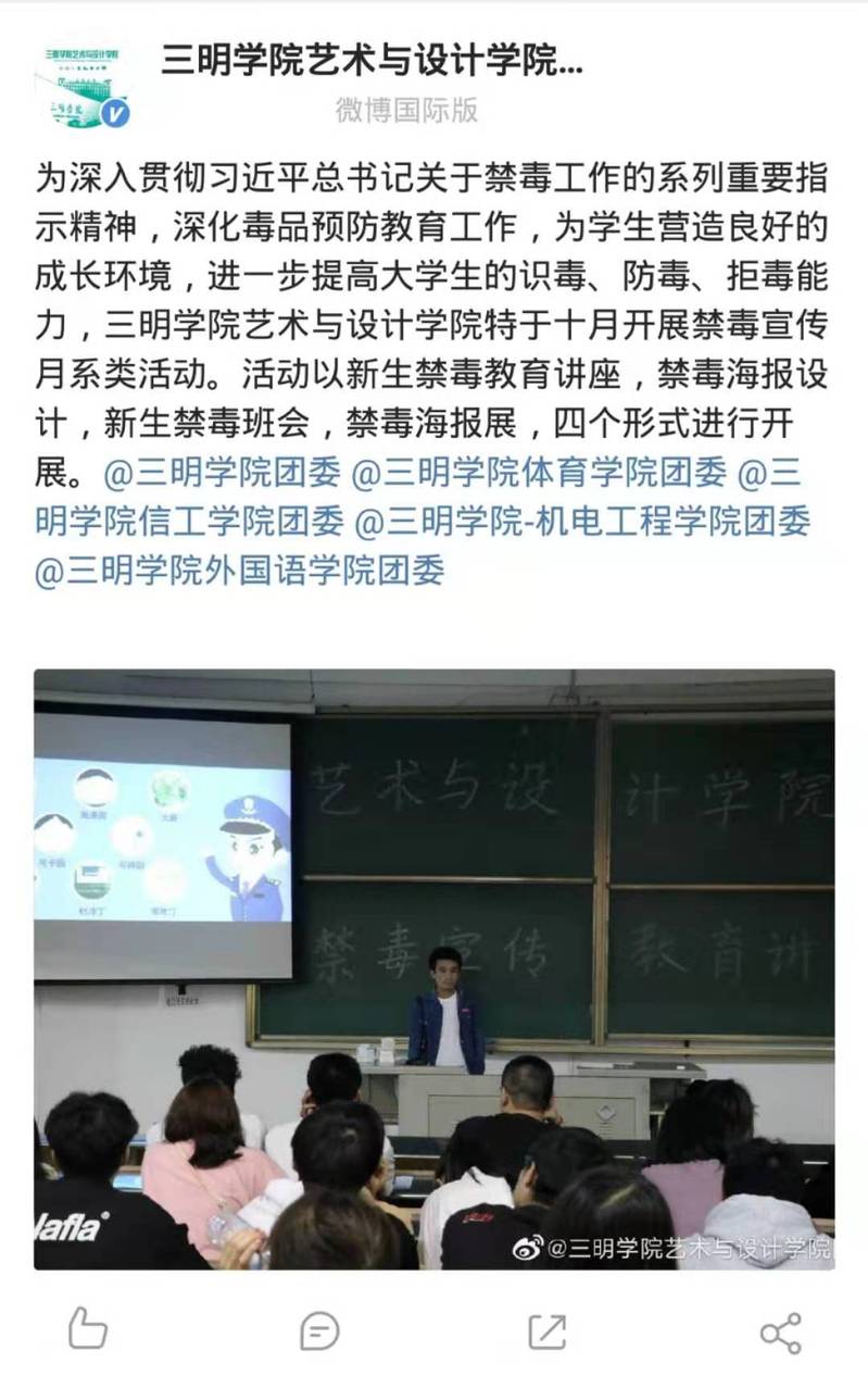 为了学生营造良好的成长环境,进一步提高大学生的识毒、防毒、拒毒能力,三明学院艺术与设计学院特于11月初开展禁毒宣传月系列活动。活动以新生教育讲座,海报设计,禁毒班会等形式进行开展。