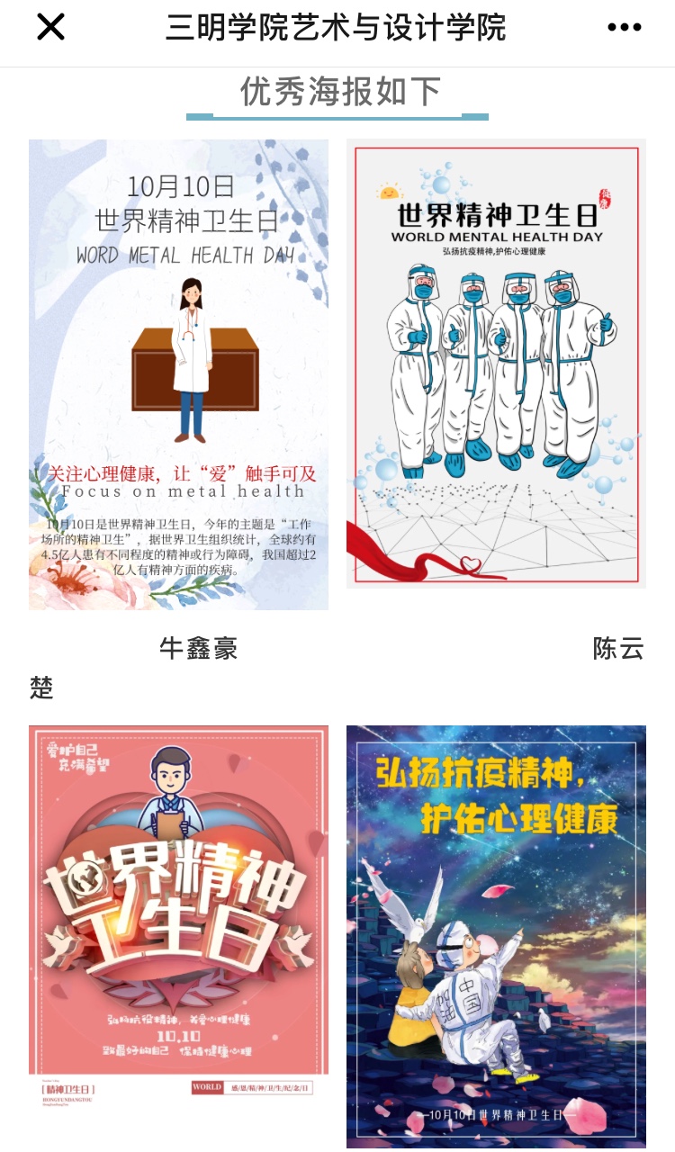 为进一步科普宣传学生精神卫生和心理健康意识,倡导社会关注、支持精神卫生和心理健康工作,艺术与设计学院组织开展世界精神卫生日海报设计宣传活动。学生以“聚焦世界精神卫生日”、“援助行动”、“让爱触手可及”等主题进行了海报设计,此次活动收到海报设计作品60余份,通过学生参与海报设计提高学生对心理健康和精神疾病相关知识知晓率,推动形成理解、接纳、关爱精神疾病的氛围。