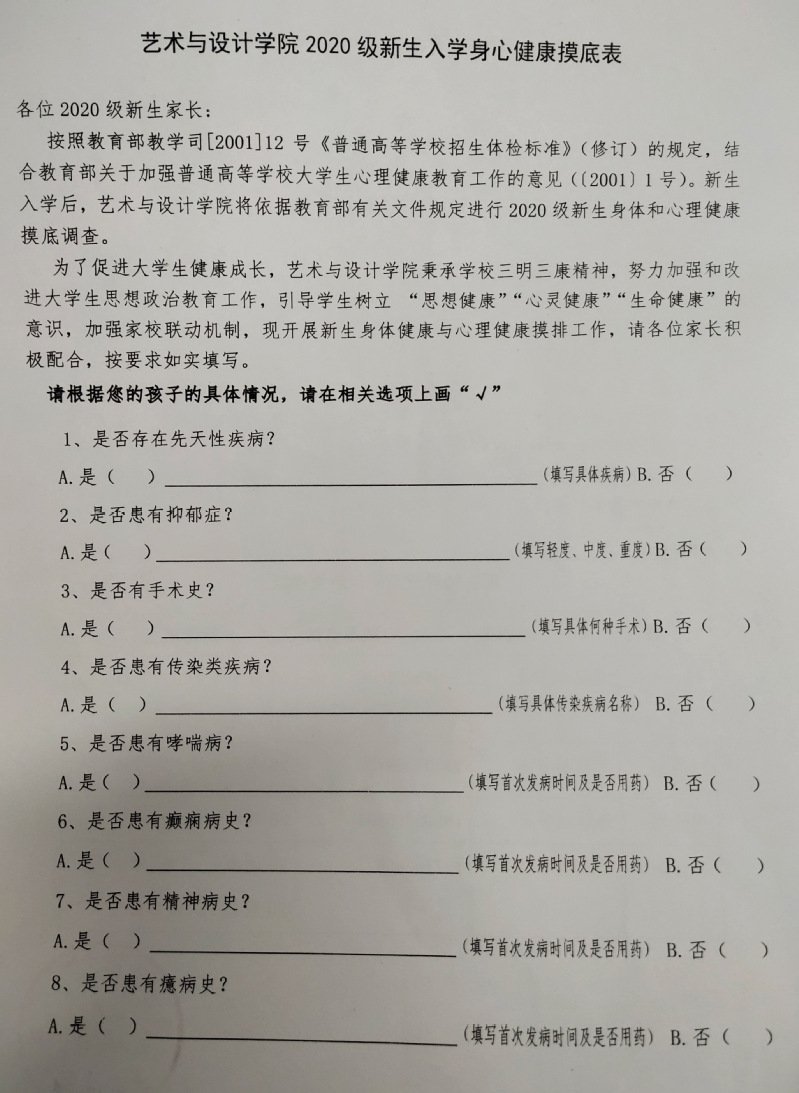 为了促进大学生健康成长,艺术与设计学院秉承学院三明三康精神,加强家校联动机制,努力加强和改进大学生思想政治教育工作,开展了新生身体健康与心理健康摸排工作。