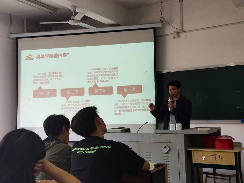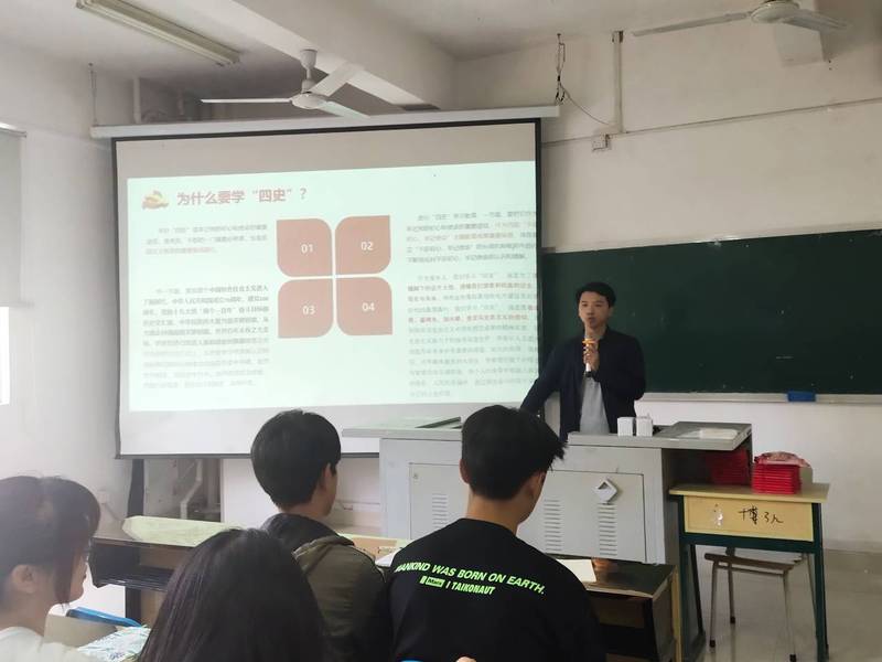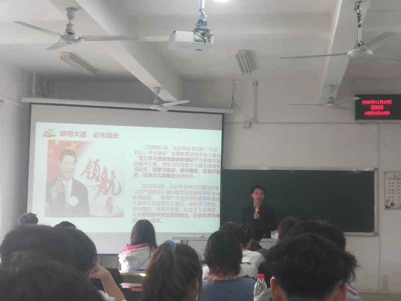 此次讲座的主讲人是林枭老师,林枭老师以学“四史”坚定信仰,秉初心践行使命起头,在讲座上,主要围绕四个部分进行讲解:一、什么是“四史”;二、“四史”教育如何提出;三、为什么要学“四史”;四、具体学那些内容以及如何学。欲明大道,必先知史。同学习马克思主义原理贯通起来,同学习党史,新中国史,改革开放史,社会主义发展史结合起来。同时,林枭老师也通过视频播放和与同学互动的方式让同学们对四史有更深刻的理解,并且对大家提出总结历史经验,把握历史规律,更好地开拓前进,走向未来的殷切期望。