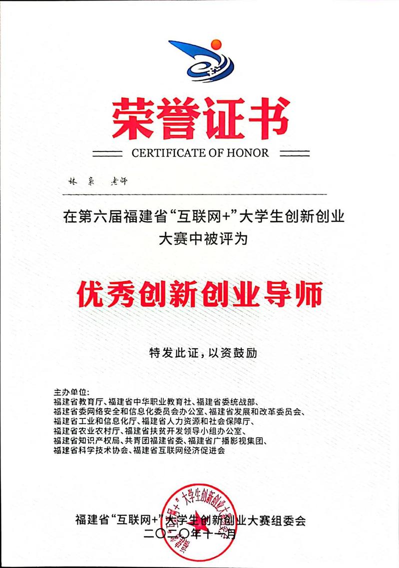 另外,戴克林、林枭老师在第六届福建省“互联网+”大学生创新创业大赛中荣获优秀创新创业导师称号。