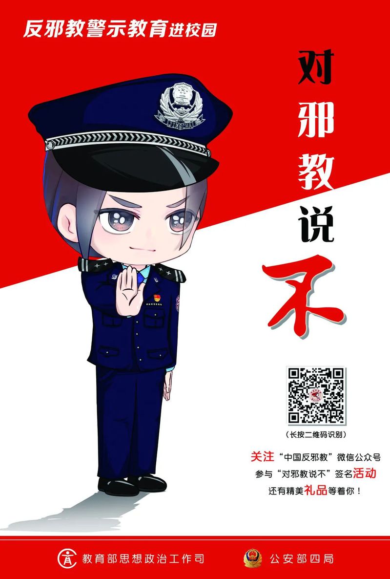 关注下图中二维码“中国反邪教”微信公众号,参与线上反邪教警示教育项目(“对邪教说不”签名,反邪教知识竞答、反邪教资料宣讲和抽奖活动)。