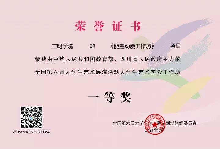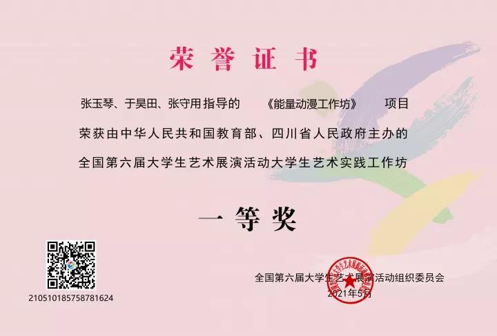 5月6日至13日,由中华人民共和国教育部、四川省人民政府共同主办的全国第六届大学生艺术展演活动在成都举办,该活动是教育部主办的我国目前规格最高、规模最大、影响最广的大学生展示平台,每三年举办一次。本次展演分为艺术表演类、艺术作品类、大学生艺术实践工作坊、高校美育改革创新案例四大类。艺术与设计学院作品《能量动漫工作坊》荣获大学生艺术实践工作坊第一名。