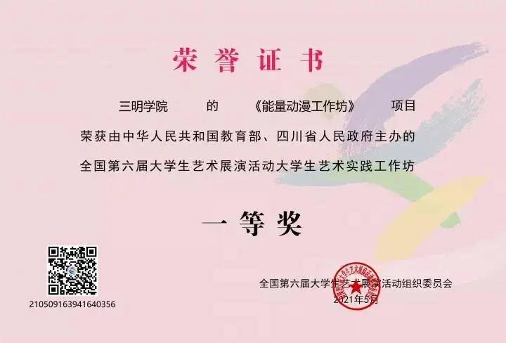 2021年5月6日至13日,由中华人民共和国教育部、四川省人民政府共同主办的全国第六届大学生艺术展演活动在成都举办,该活动是教育部主办的我国目前规格最高、规模最大、影响最广的大学生展示平台,每三年举办一次。本次展演分为艺术表演类、艺术作品类、大学生艺术实践工作坊、高校美育改革创新案例四大类。艺术与设计学院作品《能量动漫工作坊》荣获大学生艺术实践工作坊一等奖。