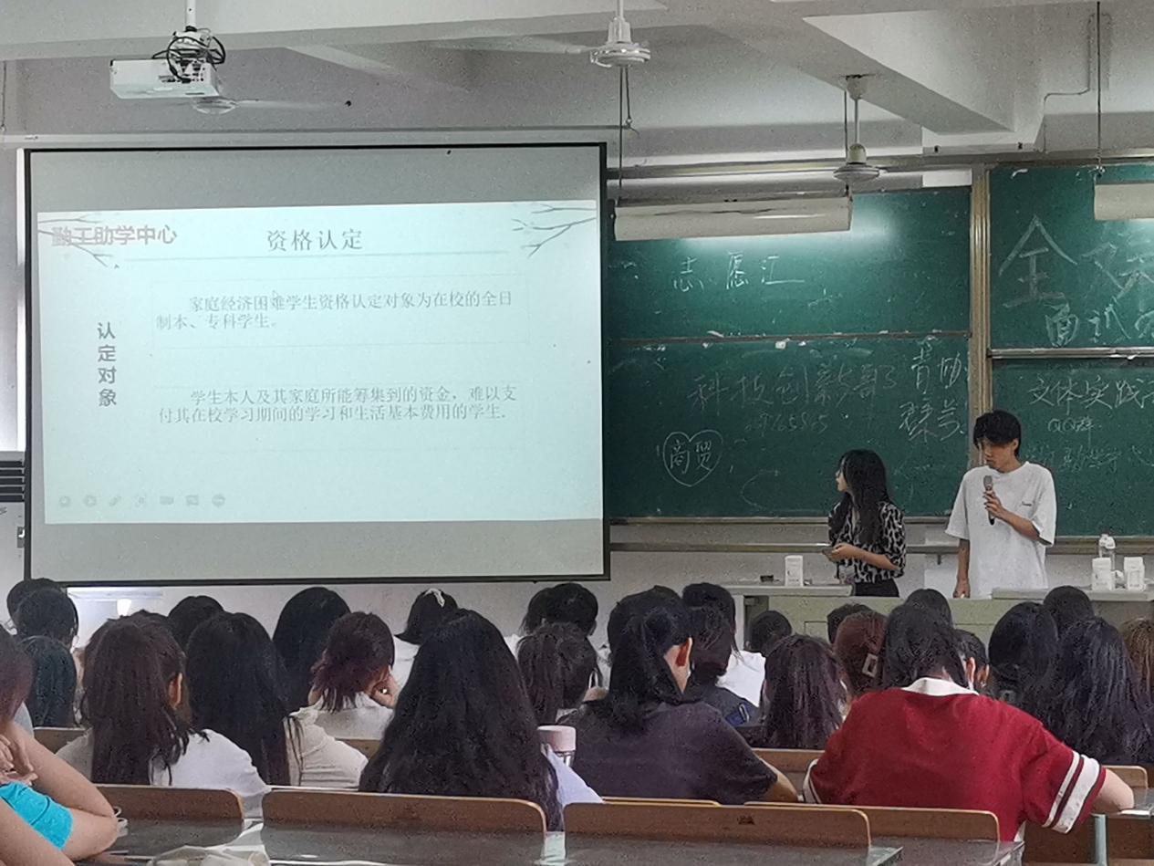 早上九点,在各班小导的组织下,各个专业班级按班就坐后,由勤工助学中心的工作人员在各个班级大一新生普及相关知识。