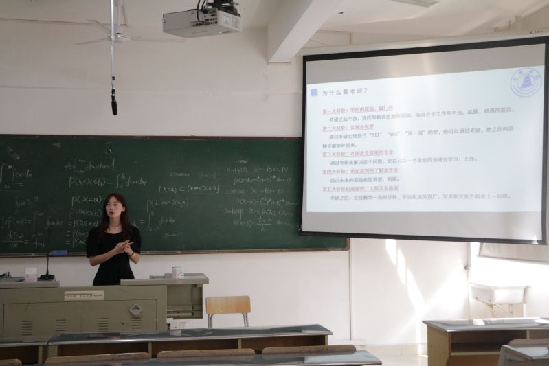 陈慧丹就当前考研现状入手,引出为什么要考研的问题,与同学现场进行交流。随后切入主题从前期准备、备考初试复试、调剂四个方面,为学生们进行详细的解说。