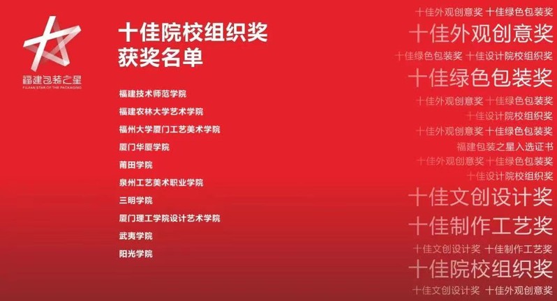 我校也在此活动中脱颖而出,勇获佳绩。其中,由艺术设计系主任于建锋指导,学生许凯隆、陈嘉彬、罗盺铭等人设计的作品《沙县特产包装设计》荣获“十佳绿色包装奖”。高奇、巫龙辉、喻宵翔、王舒琪、尹琪唯等荣获优秀作品奖。同时,我校也荣获“十佳院校组织奖”。