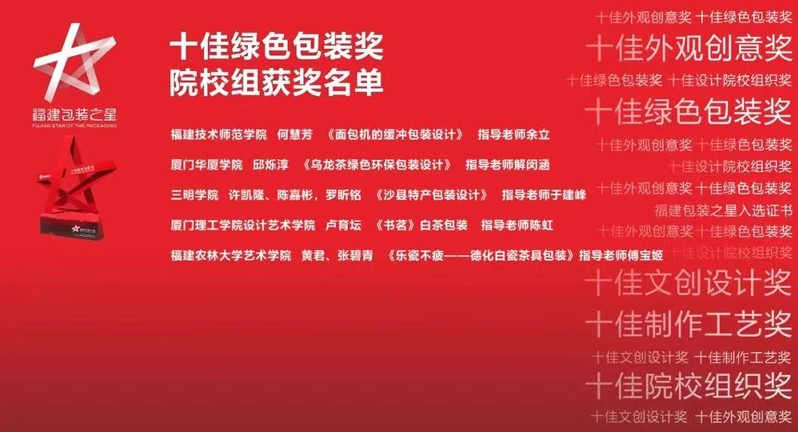 2022首届“福建包装之星”十佳评选活动历时近一年,经初评、复评、终评等多个程序,终于迎来颁奖的荣耀时刻,来自茶包装行业企业、福建省各大院校师生200多人出席本次颁奖典礼。