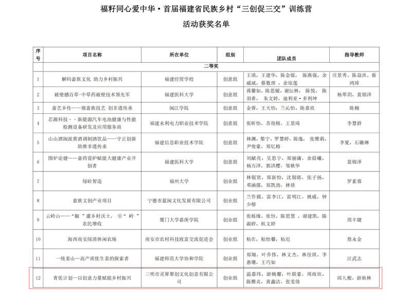 近日,福籽同心爱中华·首届福建省民族乡村“三创促三交”训练营活动在福州落下帷幕,由艺术与设计学院邱九根、游耿林指导的《青优计划——以创意力量赋能乡村振兴》获创业组二等奖。