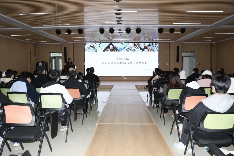 孙文娟博士从“岩彩概念界定”“中国岩彩画的历史流变”“岩彩画的回归与现代变革”“岩彩画的现代语言建构”四个方面深入浅出地讲解了岩彩画的历史发展脉络及其在当下所发生的转型变革,带领在场师生一起深入了解了岩彩画。此外,孙文娟博士分享了自己从一名本科生一步步成长为一名博士的学习历程,勉励同学们认真学好专业知识,把握实践机会,学会学以致用。