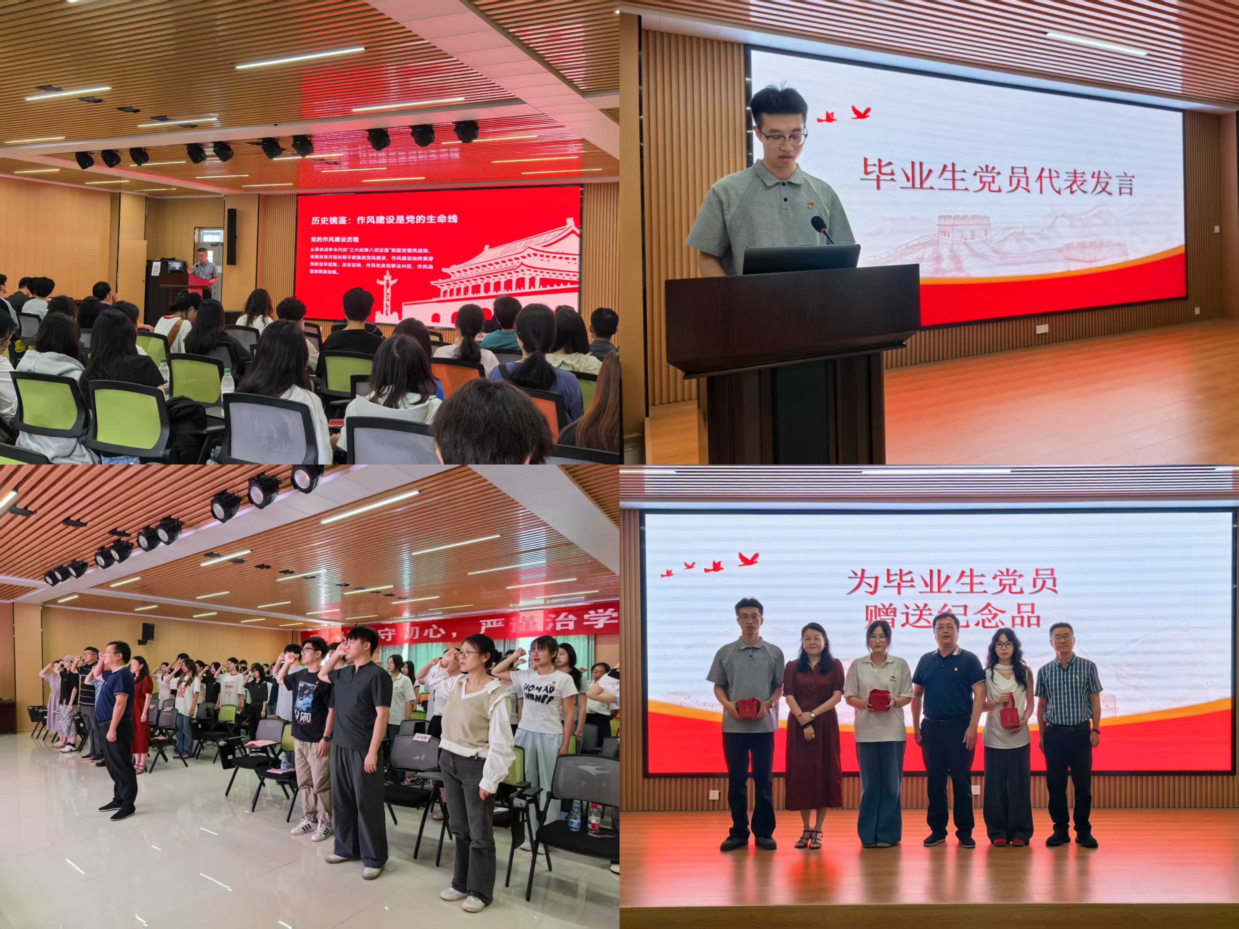 重温誓言践使命。学院党委书记廖响华同志带领全体党员重温入党誓词。面对鲜红的党旗,全体党员神情庄重,高举右拳,字字千钧的誓言响彻会场。这不仅是对入党初心的回望,更是对使命担当的再确认,激励着毕业生党员们无论身在何方,都要以实际行动践行对党和人民的庄严承诺。