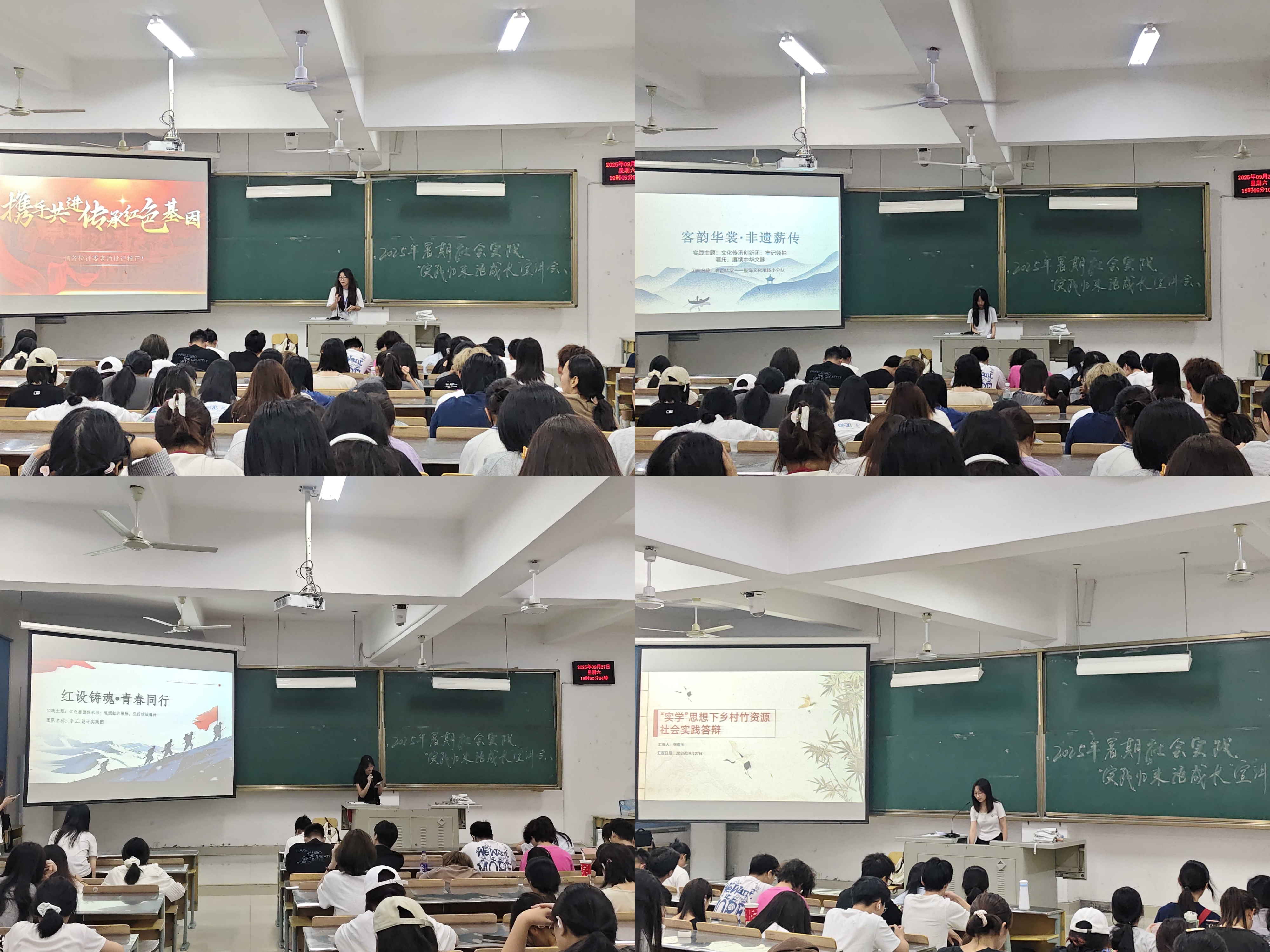 分享会上,各暑期社会实践立项团队代表依次登台,向低年级学生展示了丰硕的实践成果。“青创工坊”暑期社会实践团创新地将AI技术引入基层美育课堂,让孩子们在科技与艺术的融合中传承红色基因;手作工作室实践队深入三元区忠山村,运用三维扫描等数字技术为古建筑建立档案,探索文化遗产保护新路径;实学筑竹乡实践队聚焦竹资源创新发展,赴永安开展产业调研,见证了现代设计对竹材价值的提升作用,助力乡村振兴;“客韵华裳”实践队在沙县小吃城通过线下体验与线上平台联动传播,让游客亲身感受客家蓝染技艺的魅力,拓宽“非遗+旅游”融合发展的新思路。