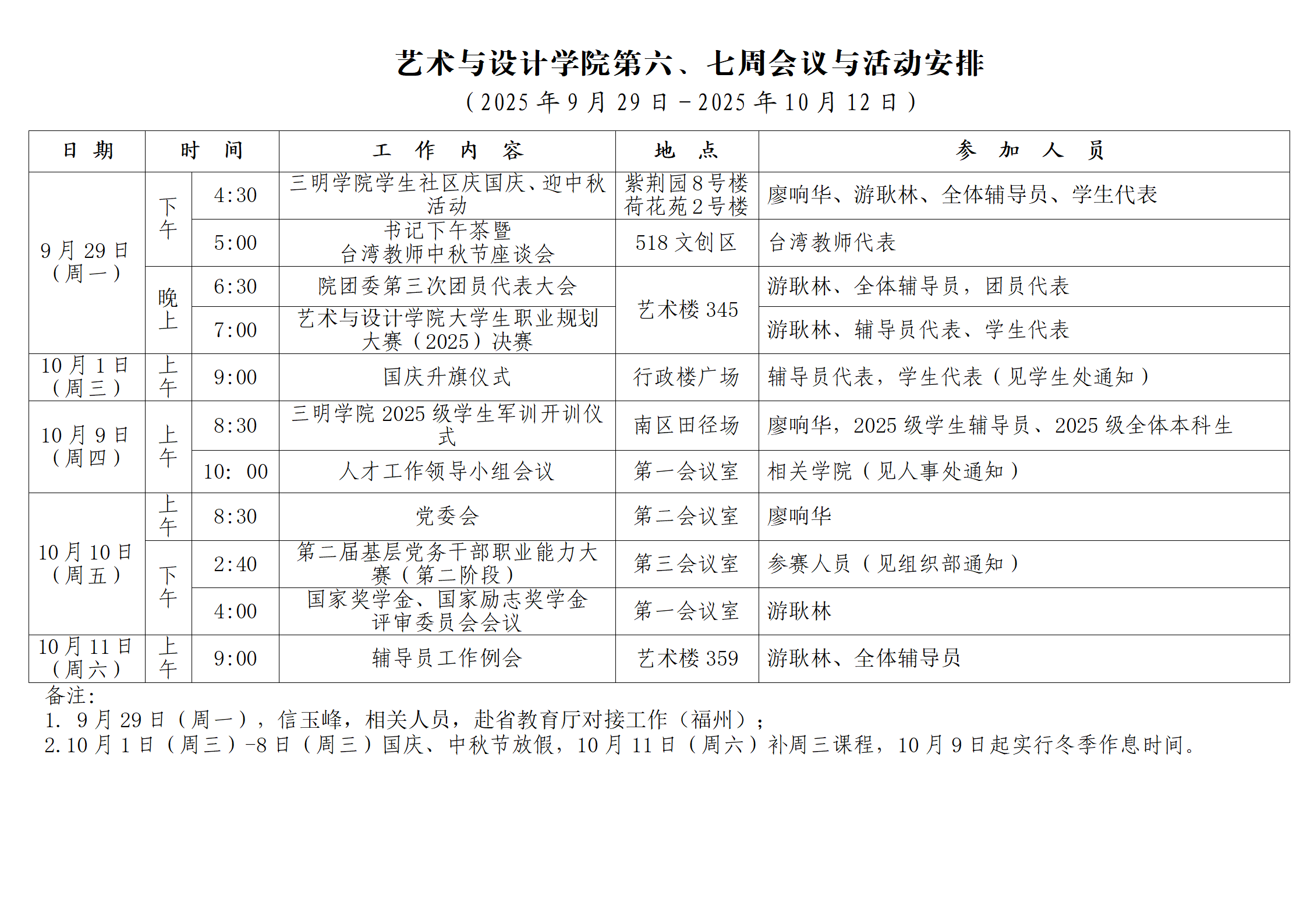第六、七周会议与活动安排(2025年9月29日-2025年10月12日)