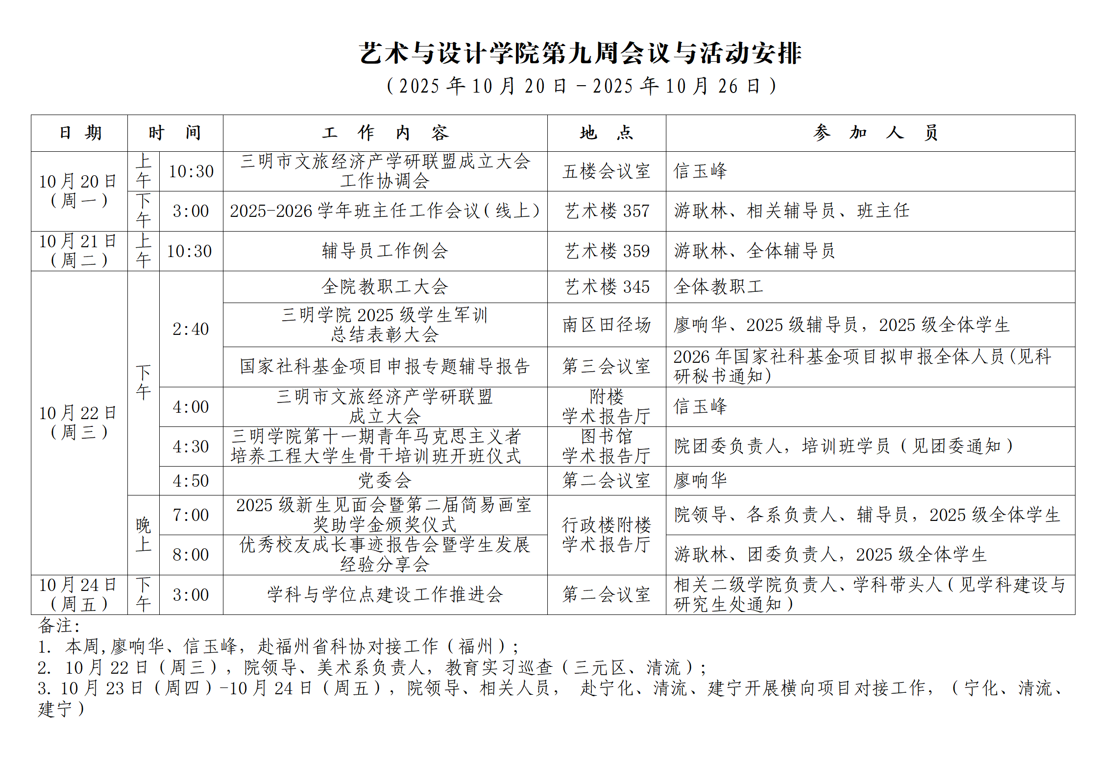第九周会议与活动安排(2025年10月20日-2025年10月26日)