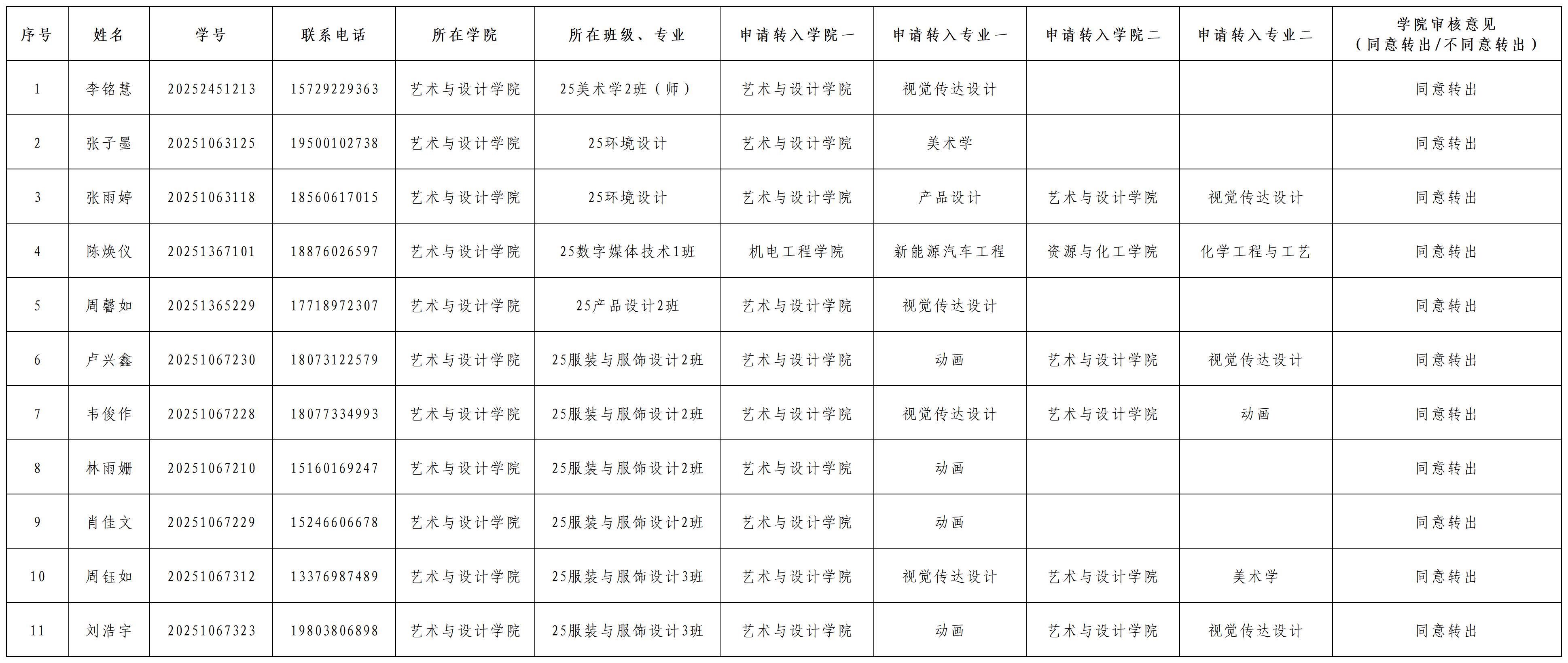 经学生申请,院内审核,院党政联席(扩大)会决定,现将2025-2026学年第一学期艺术与设计学院申请转专业学生情况公示如下:
