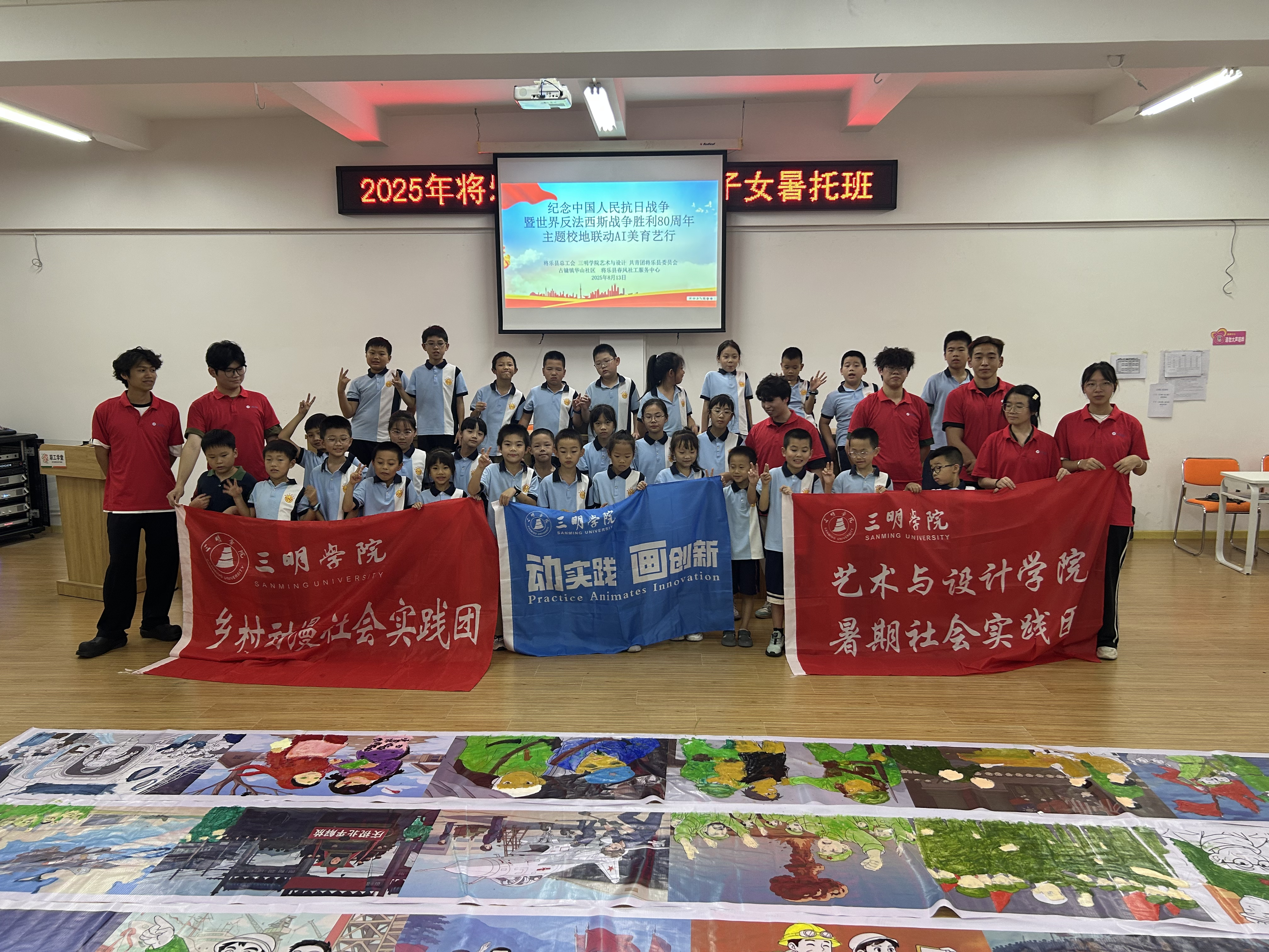 福清乡村少年宫里,一群孩子正俯身于百米画布前,用稚嫩的笔触描绘着革命故事。“青创工坊”实践团的志愿者们穿梭其间,耐心指导着每一个细节。