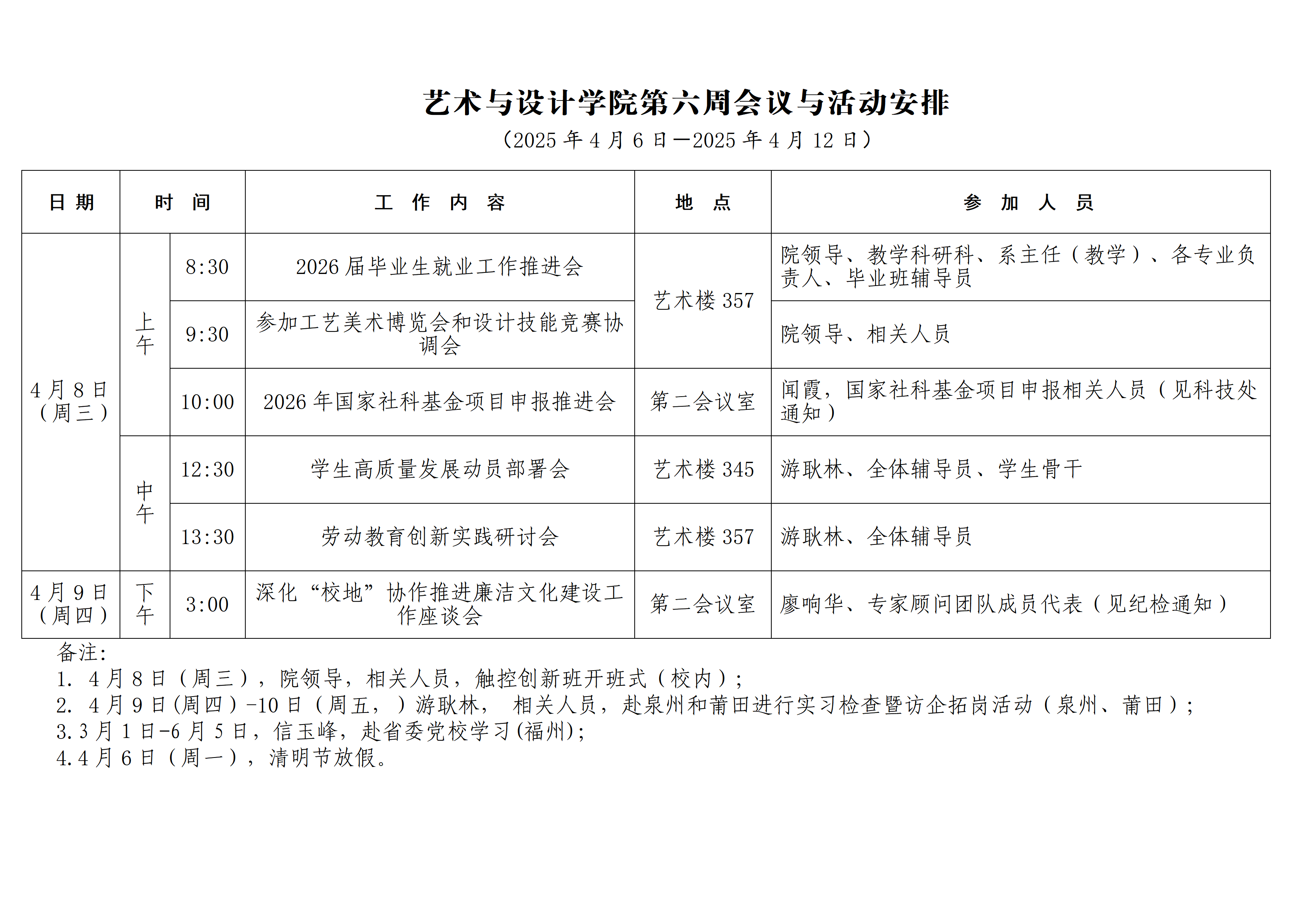 第六周会议与活动安排(2026年4月6日-2026年4月12日)
