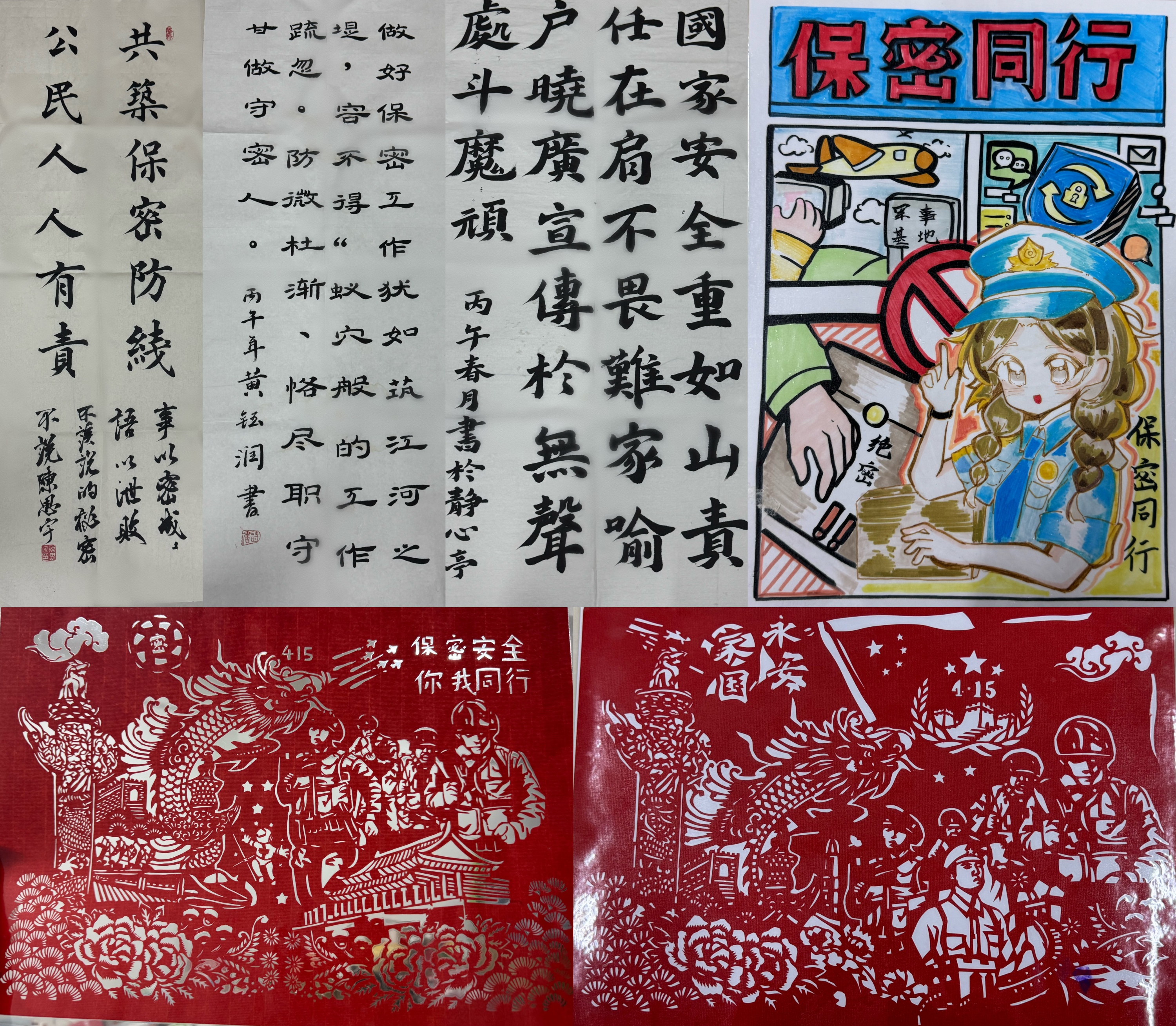 自比赛启动以来,全校学生积极参与,共征集到书法、绘画、剪纸、海报、印章等各类作品600余件。参赛作品紧扣保密主题,将传统艺术形式与保密知识、法治理念相融合。书法作品书写保密格言与法律法规条文,绘画作品描绘保密场景与安全图景,剪纸作品运用象征手法表现“严守”与“责任”,印章作品以“守密如城”等印文突出主题。获奖及优秀作品在4月15日全民国家安全教育日当天开展的保密普法游园会中展出,供全校师生观摩学习。
