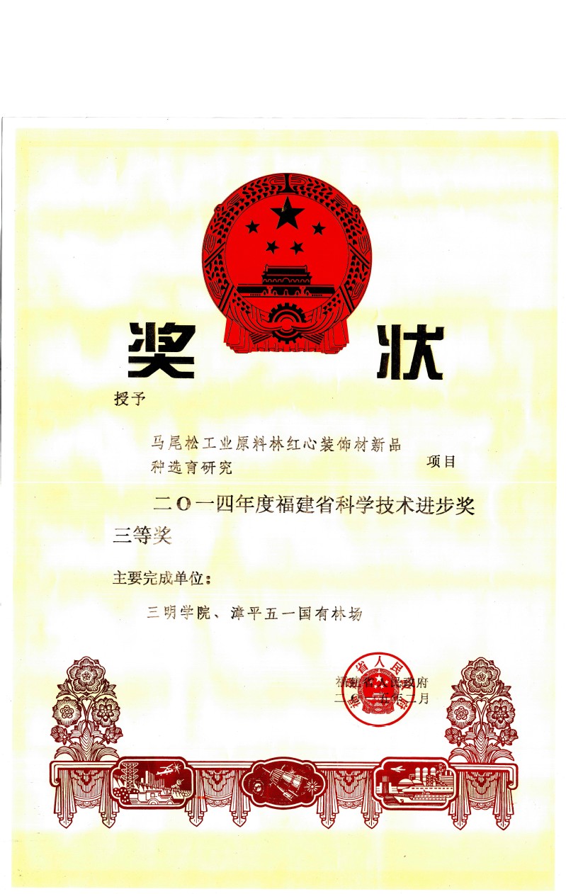 成果名称:马尾松工业原料林红心装饰材新品种选育研究