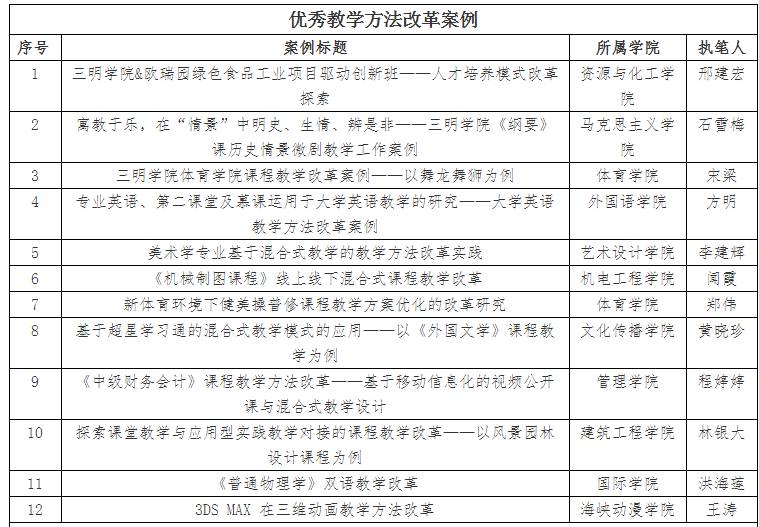 近期,我校教务处为总结凝练优秀教改成果经验,进一步深化教学改革,提高人才培养质量,组织开展了优秀教学方法、课程考核改革优秀案例征集评选活动。工程中心邢建宏老师申报的“三明学院&欧瑞园绿色食品工业项目驱动创新班——人才培养模式改革探索”入选优秀教学方法改革案例。本次活动经专家评审,共评出优秀教学方法改革案例12篇,优秀课程考核改革案例6篇。